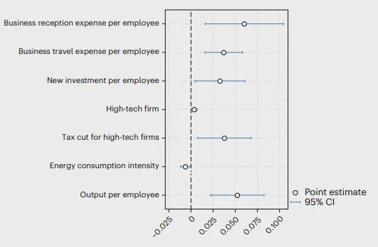 图 3. 高速铁路开通后,城市地区企业获得更多资源并提升效率。本图展示了高速铁路开通对若干企业级变量的不均衡影响。除“高新技术企业”外,所有因变量均先采用反双曲正弦变换(即 arsinh(x) = log[x + √x² + 1]),再进行标准化处理(能源消耗强度按总产出标准化,其余按员工数量标准化)。所有回归均采用公式(2)估计,详细结果见补充表6和7。数据以HSR×Urban估计系数(点)±95%置信区间(误差线)呈现。