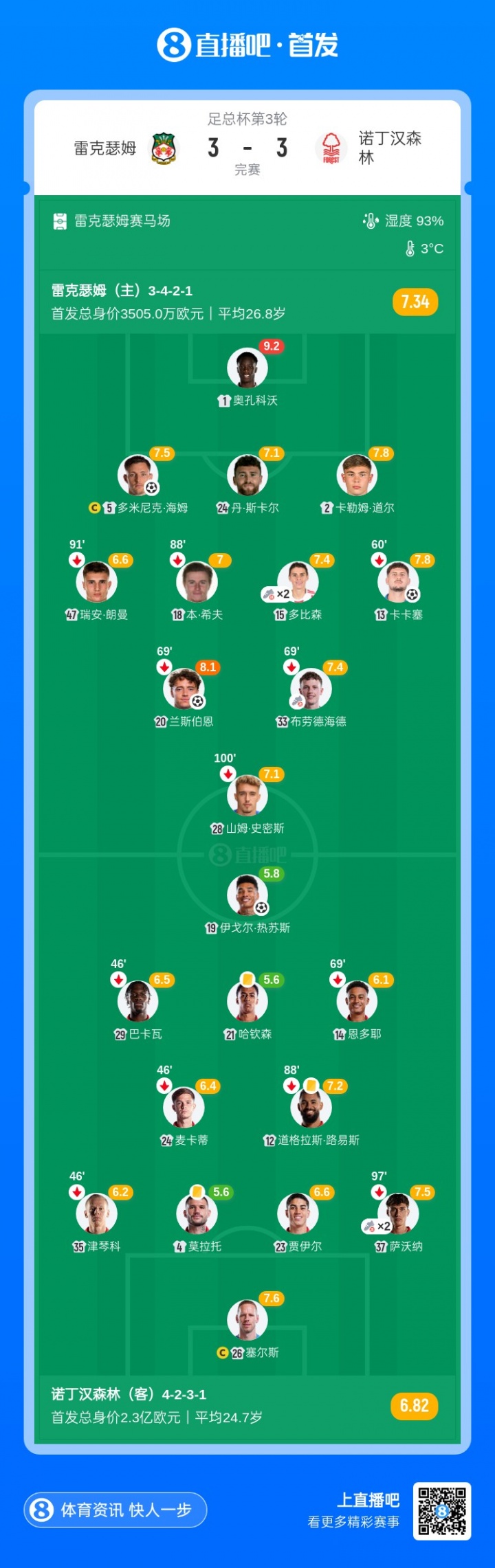 值得一提的是,雷克瑟姆本场比赛的11人首发身价之和刚刚超过3500万欧元,对手森林(2.3亿)是他们的6倍。但最终雷克瑟姆还是凭借顽强的发挥上演了以下克上的奇迹。